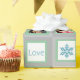Adicione quatro fotos digitais personalizadas e de médio porte a este papel de moldura de moldura quadrado elegante e elegante que diz "amor e alegria" com tons claros e escuros de cinza, verde-menta e azul-pó macio.