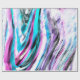 Mistura de algo que parece listras ou faixas curvadas com gradiente de ciano e cor de rosa, com partes da imagem chuviscadas, em tonalidade branco a maior parte dos chuviscos.