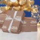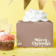 Um fundo de café mudo, texto colorido creme. Feliz Natal é escrito com uma fonte retrô do estilo 70. Personalize e adicione seu nome de família.
