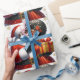 Desembrulhe a alegria dos feriados com este festivo papel de embrulho de Natal, apresentando um padrão emocionante de Papai Noel compartilhando um momento alegre com uma mulher sorridente feliz em receber um presente. Colocado contra um fundo branco nítido, este papel de embrulho captura os momentos de feriado coloridos e divertidos em um padrão que se repete em toda a folha, perfeito para embrulhar presentes com um toque de magia e capricho animador.