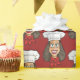 Cabeça de chef com chapéu, corcunda vermelha e texto personalizado.