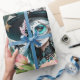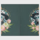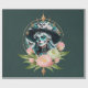 Mulher espantosa adorada com uma espantosa maquiagem do crânio de açúcar. As cores brilhantes e os intrincados padrões contam histórias de vida e morte, dando a ela um olhar alegre, mas respeitoso, que é perfeito para Día de los Muertos. Seu cabelo longo e fluente brilha uma brilhante turquesa que flui sobre seus ombros como uma cachoeira de cor. Ele pega a luz e melhora o humor festivo do design. O fundo brilha em azuis profundos e verdes, lembrando um céu noturno, enquanto flores delicadas, rosa e brancas, dançam ao seu redor. Estes sotaques florais não só adicionam cor, como também simbolizam o amor e a memória do falecido.