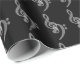 Um pedaço de música simples e elegante, a preto e branco, empacotou papel de embrulho - cordéis brancos e recifes de baixo contra um fundo preto texturizado. Amor à Música.