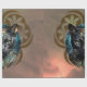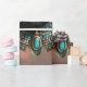 Mystical cat of Egypt, black as night, radiant as the sun. This black cat has striking, bright green eyes that immediately draw attention. The cat's head is set against a backdrop of stylized floral patterns in muted gold tones, creating a harmonious connection to ancient Egyptian aesthetics. The cat is adorned with elaborate Egyptian jewelry: gold necklaces, headbands, and earrings, decorated with turquoise stones that create a vibrant contrast with its black fur.