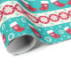 Este design de feriados apresenta um padrão típico de flocos de neve, meias e mitenes em vermelho e branco sobre um fundo azul-turquesa. Perfeito para embrulho de presente de Natal.
