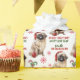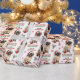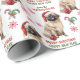 O padrão repetido neste papel de embrulho de Natal inclui uma imagem de um adorável cão Pekingês vestindo um chapéu vermelho de Papai Noel com um ornamento de árvore de Natal roubado ao seu lado. O texto vermelho e verde diz MERRY CHRISTMAS" e "Feliz ano novo" com sua assinatura personalizada abaixo. Outras imagens incluídas no padrão incluem flocos de neve decorativos vermelhos e canas doces.