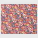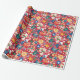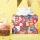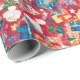 Papel festivo alegre de embalagem com um padrão de Natal colorido sobre fundo vermelho.