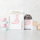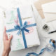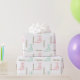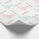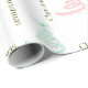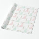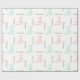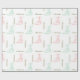 Um moderno papel de embrulho de Natal, com um padrão de árvores de Natal verdes e vermelhas, feitas de estrelas giratórias, intercaladas com a palavra "Natal" em ouro, sobre fundo branco.