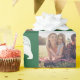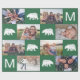 Ursos brancos e rústicos de inverno sobre um fundo verde festivo papel de embrulho de Natal com colagem fotográfica e monograma.