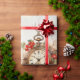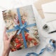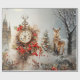 Linda cena da floresta com um veado e sua proa parada na neve ao lado de uma árvore de pinheiro. Há um grande relógio de bolso decorado com frutas vermelhas e uma bela igreja no fundo.
