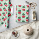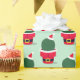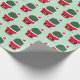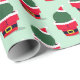 Papel de embrulho de Natal novinho com um padrão de cactos em roupas de Papai noel em fundo verde.