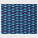 Papel de enrolação com tubarões azuis fofos, sorridentes, em chapéus de Papai Noel em fundo azul.