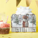 Um cachorro do Setter Irlandês vestindo um chapéu de cinza e cachecol está em uma floresta nevada perto de um boneco de neve no Natal.
