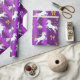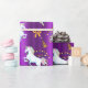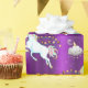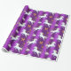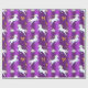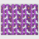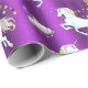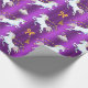 Um papel mágico e roxo de embrulho de natal unicórnio. Este lindo invólucro unicórnio tem um padrão especial de unicórnios de Natal com estrelas douradas e sinos dourados ao redor de seus pescoços, saltando sobre um fundo roxo brilhante e metálico. Eles estão cercados por arcos ouros, minúsculas árvores de natal ouros e nuvens de unicórnio kawaii bonitinhas, cheias de ouros.