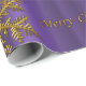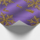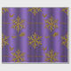 Este belo luxo papel de Natal apresenta um padrão festivo roxo e dourado que chama a atenção. Há grandes flocos de neve de ouro metálicos, montes de ouro com minúsculas bagas vermelhas, trenós de Papai noel de ouro sendo puxados por uma rena de ouro e a popular saudação de "Feliz Natal".