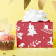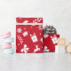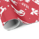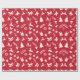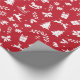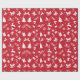 Um papel de embrulho vermelho, com um padrão de Natal branco, com árvores de Natal, renas, presentes, flocos de neve, estrelas, arcos, cavalos de balanço, mangas, folhas de cor, sinos, galhos e chapéus de Santa.