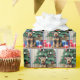 Cachorro bonito de Welsh Terrier, posando na árvore de Natal com presentes de Natal e borda azul. A cor da borda pode ser alterada.