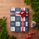 Christmas gift wrapping paper feature modern calligraphy merry Christmas and happy new year, family name typography, with personalized two photos in navy blue and white.