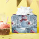 Um boneco de neve está vestido com um chapéu vermelho e cachecol, segurando uma xícara de bebida quente em uma paisagem serena de inverno