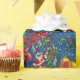 Pintura colorida, branca e artística em acrílico para o Natal. Santa Claus, musical de neve Noite de inverno com ornamentos florais, plantas decorativas verdes, fitas vermelhas, bagas ocas, cogumelos, marionetas e brinquedos na neve de Búlgaro Lumini (c)