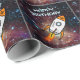 Este empolgante papel de embrulho de aniversário foi projetado para rapazes e raparigas - de qualquer idade. O fundo repleto de estrelas é uma imagem criada pelo telescópio Spitzer da NASA da nebulosa da campainha. O nome e a idade são mostrados no foguete cor de laranja e podem ser personalizados conforme necessário. [Crédito da imagem: NASA/JPL-Caltech/Harvard-Smithsonian CfA]