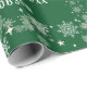 Papel de embrulho de Natal moderno, elegante e fofo, com um desenho de Santa Cláusula em seu chapéu e fantasia vermelhos, o texto "Feliz Natal e Feliz ano novo 20XX" em letra de na moda / caligrafia, e um nome personalizado. Com borrifas de flocos de neve brancos e prateados, e dois pares de sinos de Natal ouro com um cintilante de holly, sobre um fundo verde de Natal. Certifique-se de personalizar o nome e o ano.