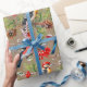 Um papel de embalagem de férias com cones de pinheiro pintados a aquarelas, morangos vermelhos, um Pica-pau pintado a vermelho, um Pássaro Bluebird oriental e um Bullfinch Eurasiano, em padrão repetido e firme, em um fundo de papel a cores Kraft.