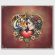 O coração da selva oculta, um tigre majestoso, e o perfil de uma mulher são maravilhosamente misturados. Ambos os modos estão inseridos em uma elegante estrutura em forma de coração, destacando o humor romântico. O quadro é ricamente decorado com delicados padrões florais que fluem harmoniosamente ao seu redor, dando-lhe um toque lúdico e imaginativo. Em meio às flores há um coração vermelho brilhante, simbolizando amor e paixão.