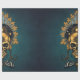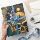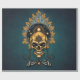 O crânio do Ouro e seus segredos cósmicos. O crânio senta-se majesticamente contra um fundo azul infinito e profundo que recorda os mistérios do universo. Seu ouro brilhante reflete a luz das estrelas, dando-lhe uma aura quase sobrenatural. Um quadro circular paira sobre o crânio, revelando uma cena celestial: um sol radiante cujos raios de ouro perfuram a escuridão, planetas em formação majestosa, e estrelas cintilantes que brilham como diamantes no céu noturno.