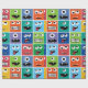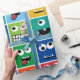 O monstro do teste padrão dos monstro dos miúdos enfrenta o papel de envolvimento engraçado colorido. Caras coloridas engraçadas do monstro com os um e dois olhos no teste padrão quadrado brilhantemente colorido. Quadrados vermelhos, alaranjados, amarelos, verdes, azuis e roxos no teste padrão repetido. Fontes do partido do monstro do divertimento.