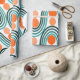 Este papel de embrulho tem um design moderno do século médio de ondas de carvão e círculos laranja.