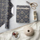 This elegant wrapping paper features a luxurious navy blue background adorned with intricate gold and cream floral motifs, creating a sophisticated baroque style. The symmetrical layout showcases large stylized flowers surrounded by smaller buds and leaves, offering a richly decorated appearance that exudes timeless elegance. Perfect for special occasions, this design captures an opulent mood, making it ideal for gifting and celebrations where a touch of classic luxury is desired.