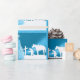 Cowboy rezando na silhueta da cruz em branco sobre fundo azul-turquesa. O cavalo Cowboys está atrás dele e há uma árvore de Natal com uma estrela.