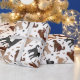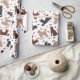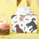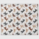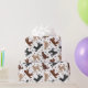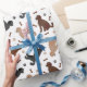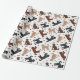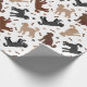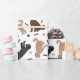Labradodles bonitos em casacos castanhos, pretos e bronzeados, sentados, sentados e deitados com ossos de cão espalhados e estampas de pata sobre fundo branco.