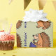 Ouriço engraçado maravilhoso que joga um papel de envolvimento azul do feliz aniversario do saxofone. Maneira do divertimento de personalizar esse presente especial.