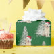 Um filhote bonito de ouro com o chapéu de Papai Noel e uma árvore de férias branca em flocos de neve em um fundo verde. A cor de fundo pode ser alterada.