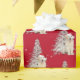 Um filhote bonito de ouro com o chapéu de Papai Noel e uma árvore de férias branca em flocos de neve em fundo vermelho. A cor de fundo pode ser alterada.