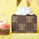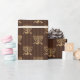 Aqui temos um papel de embrulho que apresenta uma menorah ouro sobre um fundo listrado vertical marrom claro e escuro. Este documento está disponível em vários tamanhos e corresponde a outros papéis de embalagem, papéis de tecidos, sacos de presentes e um cartão de saudação. Isso certamente fará uma adição perfeita aos seus presentes nesta temporada de festas.