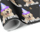 Recuperador de ouro bonito com chapéu de festa de aniversário, texto branco e confete dourado sobre fundo preto. A cor de fundo pode ser editada.