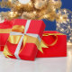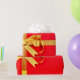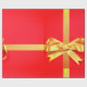 Uma caixa de presente vermelha brilhante embrulhada com uma fita dourada brilhante e encimada por um laço cheio e elegante. O contraste ousado entre o vermelho e o dourado lhe dá um clima festivo e luxuoso.