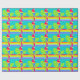 Papel de embrulho gráfico colorido e a negrito, com padrão repetido de uma simples arte gráfica de papagaio-de-arara tropical num fundo listrado do arco-íris. Arte e design por Sarah Trett.