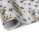 Uma imagem de um adorável Cairn Terrier Dog é a característica do padrão neste papel de embrulho de presente de ocasião. O cachorro se senta em meio a um padrão de estampas pretas e ossos brancos, e se repete em um fundo de cinza clara.