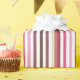 Um papel de embrulho horizontal, largo e rosado, cor-de-rosa, num padrão vermelho-escuro, rosa e branco listrado. Um padrão variegado moderno e pré-disquete em cores ousadas, mas femininas.