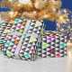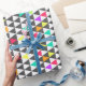 Padrão triangular geométrico fantástico, cinzas, rosa, azul, amarelo, laranja, verde, branco, néon vívido brilhante. Arte, abstrato, formas, moderna, decoradora, criativa, ilustração, tribal, trabalho de arte, estilo, design, moda, força, tendência, caprichosa, única, artística, fofa, bonito, popular, moderna, sonhosa, fresca, glamourosa, bela, legal, doce imagem. Personalize-o com seu nome de palavra ou frase favorita clicando no botão personalizar e adicionando texto, escolha a fonte e a cor do texto. Impressão de imagem