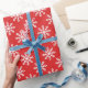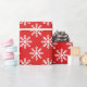 Esta imagem apresenta um fundo vermelho vibrante adornada com uma matriz de flocos de neve brancos em vários designs intrincados. Os flocos de neve se distribuem uniformemente pelo fundo, criando um padrão festivo e visualmente atraente.
