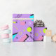 Desenhado à mão no Procreate, este anos 80 retro apresenta formas geométricas clássicas e padrões em cor-de-rosa-neon, azul e verde limão sobre fundo lavanda.