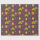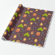 Esfregando papel com um padrão temático divertido de acampar. Colocado sobre um fundo castanho avermelhado. Elementos no padrão incluem uma fogueira, uma tenda, uma guitarra, uma pá e mochila.
