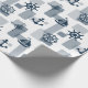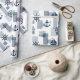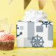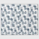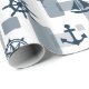 Design marítimo sem costura, com embarcação à vela, bússola, âncora e decoração das rodas de vela em fundo geométrico azul e branco