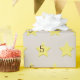 Design apresenta um padrão de estrelas douradas sobre um fundo brando. A idade da criança de aniversário aparece em todas as outras estrelas. Perfeito para festas de aniversário de temas ocidentais.
