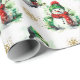 Homem de neve com chapéu verde e cachecol vermelho com padrão de flocos de neve dourados em fundo branco de neve, melhor para o presente de Natal embrulhando